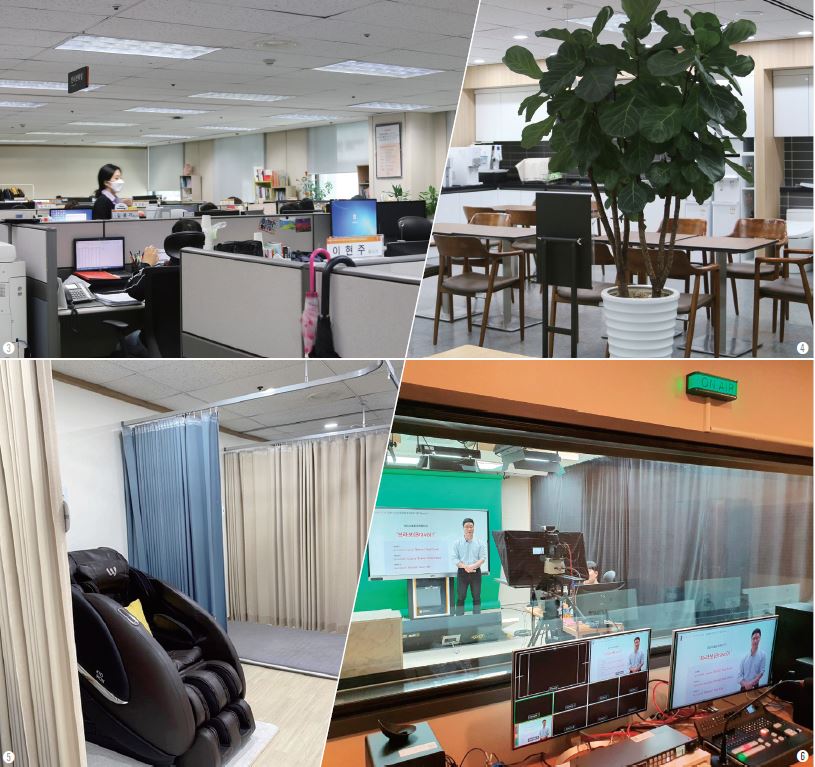 ➏ 스튜디오 : 교원그룹 내·외부에서 사용하는 사진, 영상, 음성 콘텐츠 제작 및 편집을 위한 스튜디오이다. 라이브 영상을 촬영 및 송출할 수 있는 스튜디오부터 사진 촬영 스튜디오, 녹음실, 메이크업 룸, 탈의실 등이 갖춰진 이 공간에서는 제품용 콘텐츠 제작은 물론, 직원 교육을 위한 콘텐츠도 제작된다. 특히 코로나19 확산 후 집합 교육이 어려워지면서 직원 교육용 이러닝 콘텐츠가 활발히 자체 제작되고 있다.