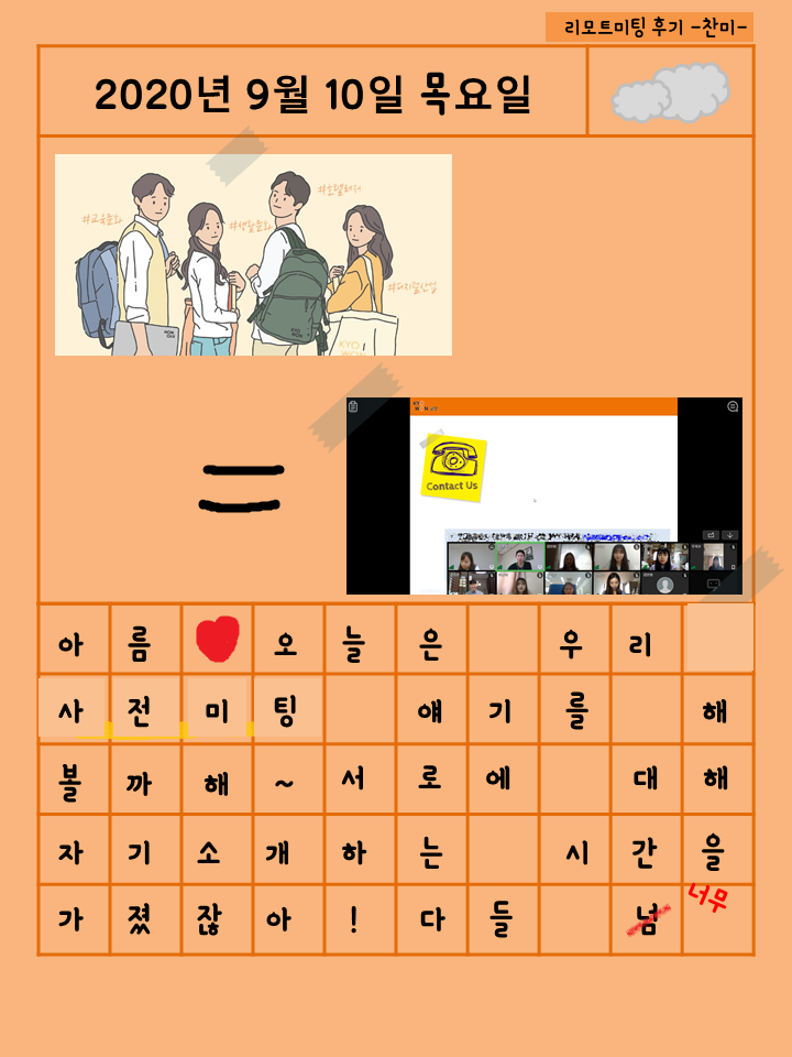 이번주 목요일인 9월 10일에 교원 드리머 1기 사전 미팅이 진행되었는데요~ 워밍업으로 이번 '리모트 미팅 후기'를 주제로 콘텐츠를 작성하게 되었습니다. 같은 교육문화사업부문에 속한 드리머끼리 9월 10일 리모트 미팅을 주제로 교!환!일!기!를 해봤어요 ><