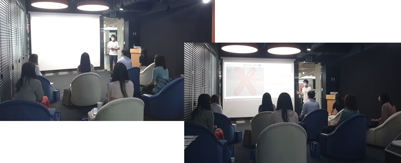 "첫 번째 시간은 블로그 콘텐츠 기획/제작으로 인재개발팀의 이휘 건 매니저님이 강사로 진행해주셨습니다. 왜 우리가 블로그에 집중해야 하는지, 어떤 차별점을 가지고 콘텐츠를 기획/구성해야 하는지, 그리고 가장 중요한 것은 대상자가 어떤 궁금증을 갖고 있는지 역지사지의 마음을 가져야 한다는 이야기를 전달해주셨습니다. 강의에 집중하는 여러분의 모습! 마스크를 쓰고도 열심히 강의해주시는 강사님의 모습도 멋져 보입니다."