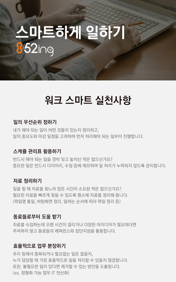 예를 들어서, ‘주 52시간제’ 관련해서 ‘852ing 캠페인’이 있어요. 주 52시간을 잘 준수하기 위해 계속 노력하자는 의미에요. 회의는 30분으로 간단하게 하자는 내용이나, ‘워크 스마트’라고 해서 효율적으로 일할 방법들을 직원분들께 알려 주는 활동을 했어요. 852ing 캠페인 외에도 다른 캠페인 활동도 직원분들이 최대한 좋은 업무 환경 속에서 일하실 수 있도록 지속적으로 노력하고 있습니다.