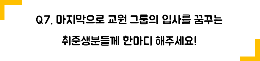 ‘취업’이라는 단어를 떠올릴 때 마다 지금도 두 가지 감정이 드는 것 같아요. ‘설레임’과 ‘두려움’. 실제 입사하시고 나면 ‘설레임’과 ‘두려움’이라는 감정을 더 느낄 수 있는 기회가 많으실 겁니다. (웃음) ‘내가 내 삶에서 진짜로 원하는 가치가 무엇인지?’, ‘3년/5년/10년 뒤, 내 모습은 어떠할 것인지?’ 등에 대한 고민을 하며 자기소개서 및 면접에 임하신다면 반드시 좋은 결과가 있을 것이라고 믿습니다. 끝까지 화이팅입니다!