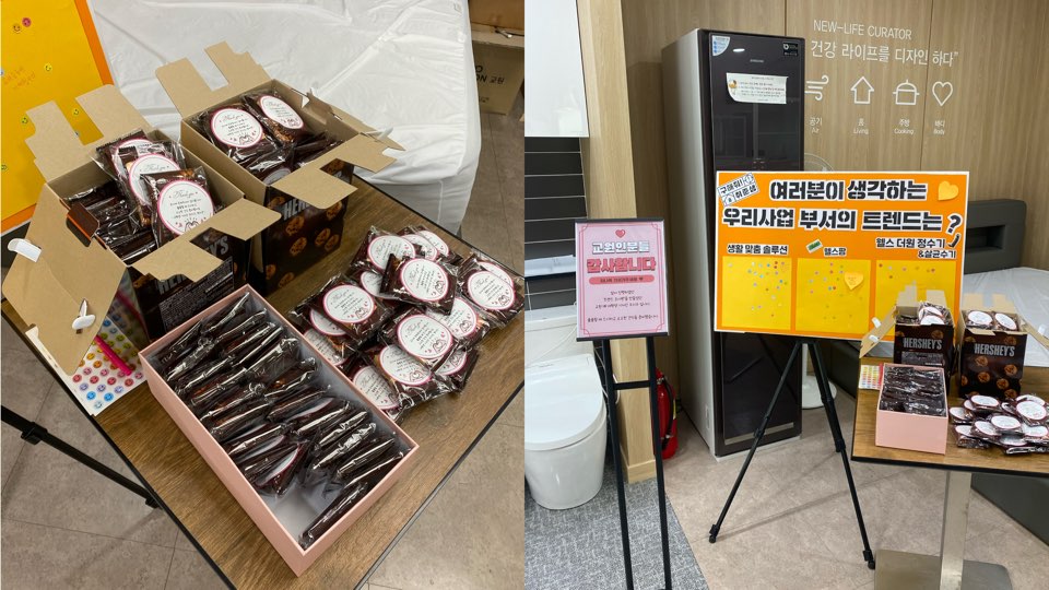 감사한 마음을 담은 스티커를 주문제작을 해서 소소한 초코 간식 세트를 넉넉하게 포장하여 비치해두었습니다. 어떤 간식이 좋을까 고민하다가 간식 선정하는 것에만 몇 시간이 걸렸다는 사실은 안 비밀!! 포장하는 내내 ‘조금이라도 힘이 되었으면 좋겠다.’라는 생각을 했는데 생각보다 좋아해주셔서 준비한 저희가 더 감사했습니다. 이처럼 따뜻함을 베풀 줄 아는 교원인 선배를 만나고 싶다면!! 교원그룹으로 come on come on!!!!