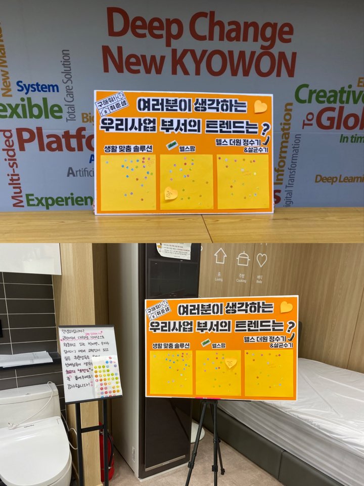 세 가지 트렌드 모두 각 자만의 매력을 가지고 있다 보니 투표 결과는 정말 치열했습니다. 총 57명의 웰스 사업본부 교원인분들이 참여해주셨고 생활맞춤 솔루션 22표 웰스팜 18표 웰스 더원 정수기&살균수기 17표입니다.