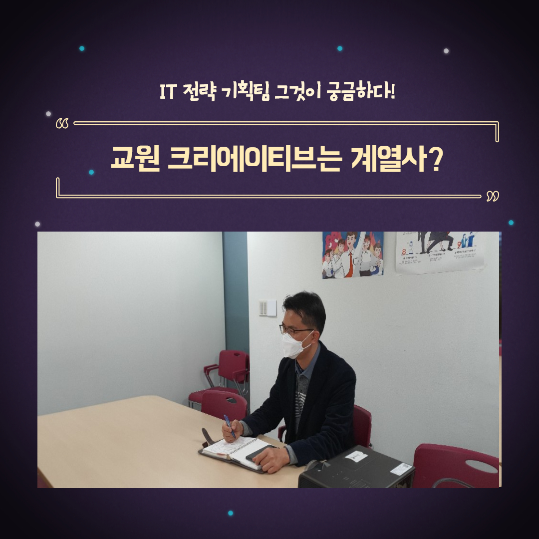 교원 크리에이티브가 출범한 지 얼마 안 되었고, 새로운 인력 충원을 많이 해서 젊으신 분이 많지만 IT전략기획은 다른 팀들에 비해 상대적으로 기존에 일하고 계셨던 분들이 많습니다. 왜냐하면 다섯 가지 영역에서 어느 정도 이해를 하고 방향성을 잡아야 하기 때문에 다른 업무를 하셨던 분들이 많이 모여 있는 편입니다. 하지만 그렇다고 연령대가 높은 건 아닙니다. (웃음)