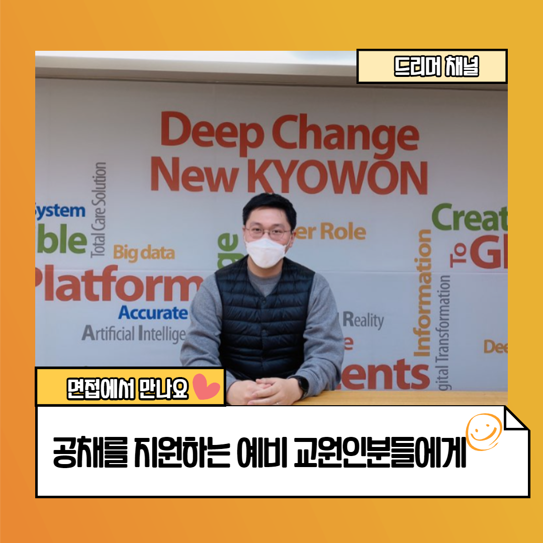안녕하십니까. 저는 생활사업부문을 맡은 교원 드리머 우지수입니다. 오늘은 기획 직무 중에서도 20대 교원인분들이 많이 모여 있는 E커머스사업혁신팀의 윤민구 파트장님을 만나뵈었습니다. 정말 다양한 직무들 중에 막연하게 ‘사업’이라는 단어가 붙어서 더욱 추상적으로 느껴지는 사업전략기획직무에 대해서 현직자이자 이번 공채의 면접관 분이 직접 어떠한 일을 하는지에 대해서 이야기를 해주신다고 하니 모두 집중해서 들어볼까요??
