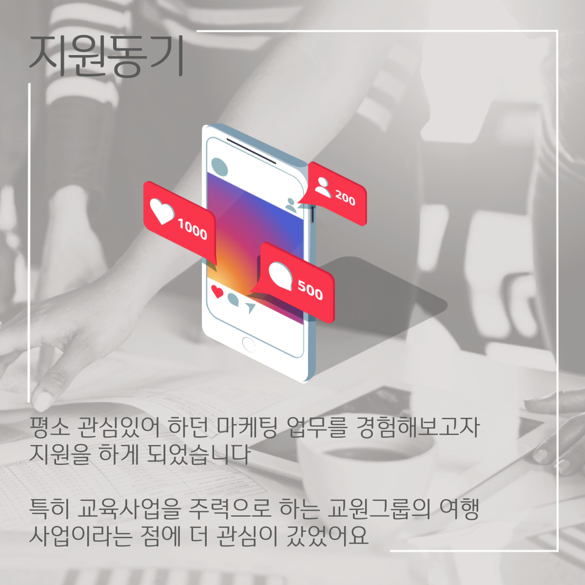 제 전공과는 거리가 있어 보이지만, (웃음) 제가 평소 관심 있게 보았던 마케팅 업무를 경험해보고자 지원을 하게 되었어요.