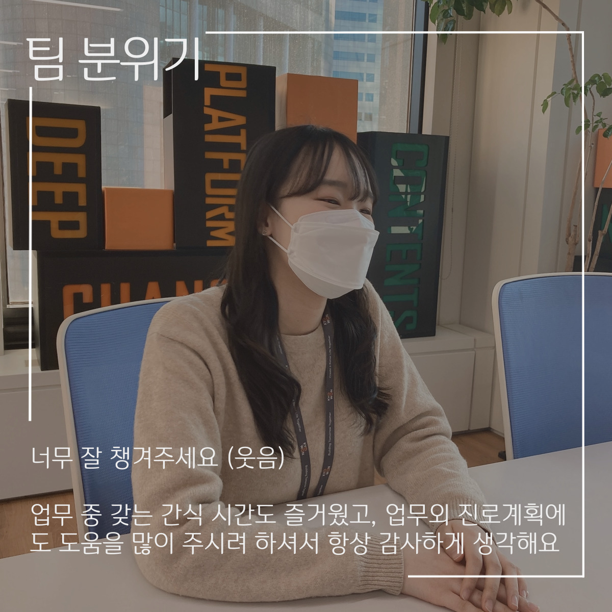 회사 생활이 처음이고 내성적인 저에게 편한 업무환경을 제시해주신 팀원분들께 감사하다는 말씀을 전하고 싶어요. 팀 막내처럼 챙겨주심과 동시에 업무적 역량을 믿고 맡겨주셔서 제가 더 용기 내서 잘 해낼 수 있었던 것 같습니다. 짧은 시간이지만 팀장님, 파트장님들, 매니저님들 모두에게 정이 많이 들었어요. 다시 뵐 수 있는 기회가 조만간 있기를 바라며 저는 이만 물러나겠습니다!