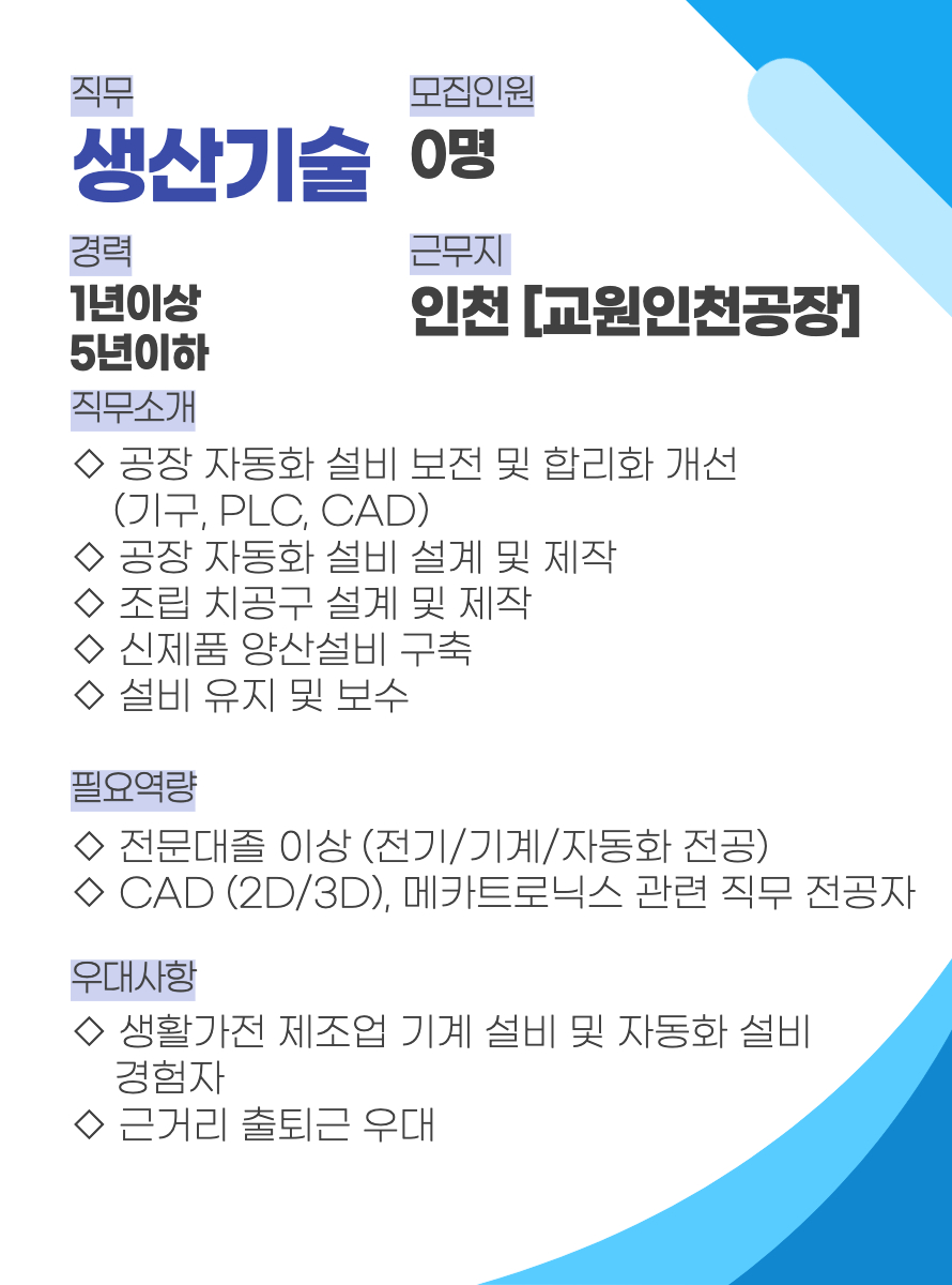 [모집안내] Wells 생산관리팀 경력직 수시채용 (생산기술)