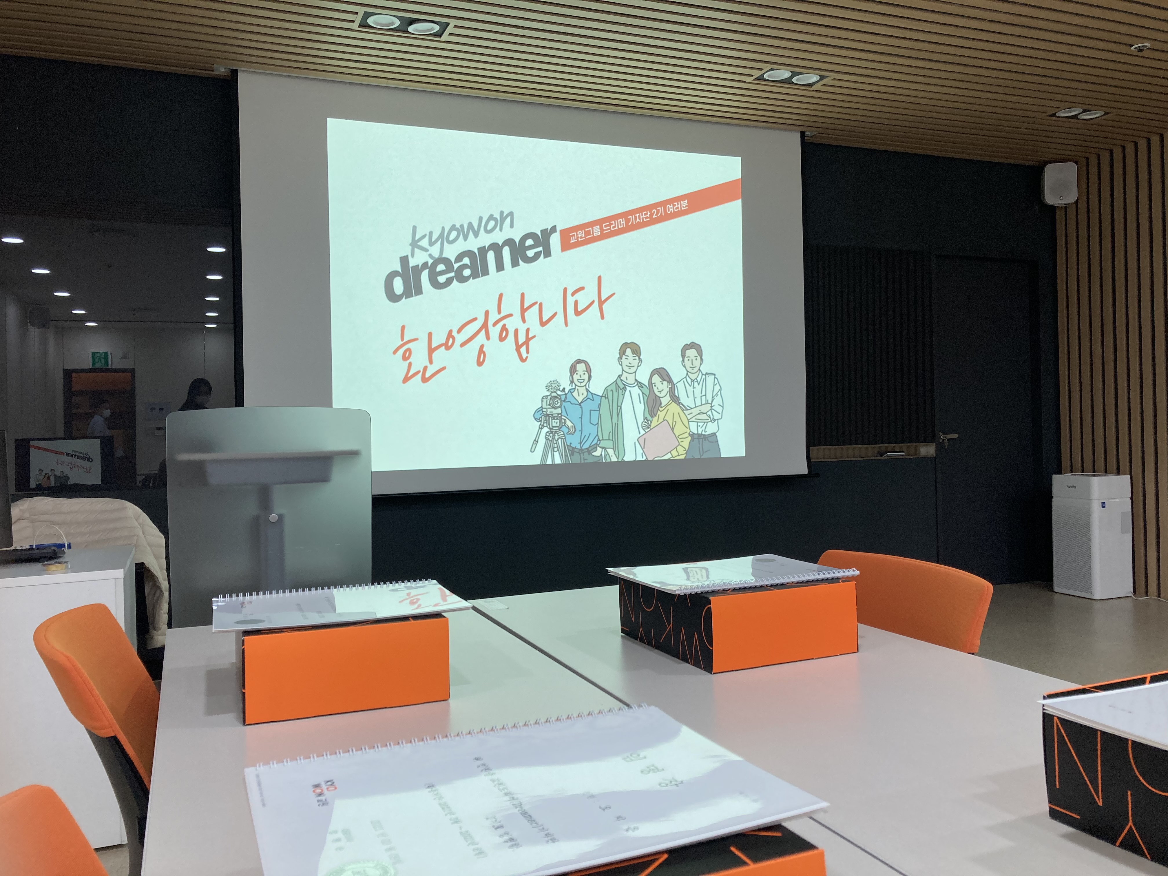 드리머 기자단 발대식은 오전 10시에 시작이 예정되어있었습니다. 하지만 기자단 여러분들을 조금이라도 더 빨리 만나고 싶은 마음에 한 시간 전부터 발대식이 진행될, [ C. Learning Center ] 에서 대기하고 있기로 하였습니다. 교원인들의 교육을 위해 마련된 [ Learning Room ] 은 오늘, 발대식 장소로 탈바꿈하였습니다.