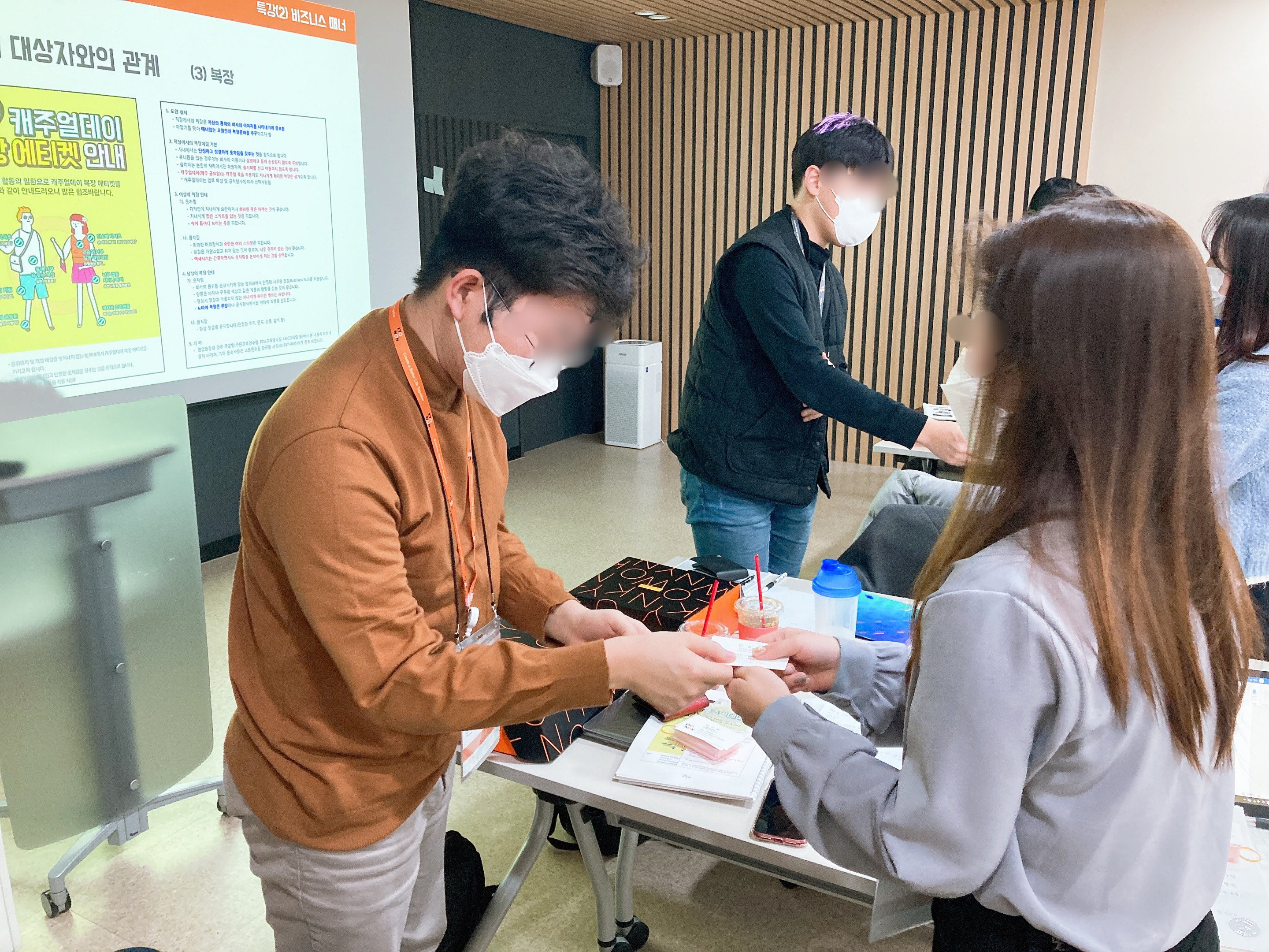 기자단 활동을 하며 콘텐츠를 기획하고, 영상물을 제작하는 것만으로는 부족합니다! 교원 드리머 기자님들께서 다소 생소할 수도 있는 비즈니스 매너 강의시간입니다. 취재 과정 중 다양한 교원인과 마주하며 비즈니스 문화에 빠르게 적응하고 녹아들 수 있도록 인재채용팀 이현주 파트장님께서 재미있는 "비즈니스 매너 강의" 마련해주셨습니다.