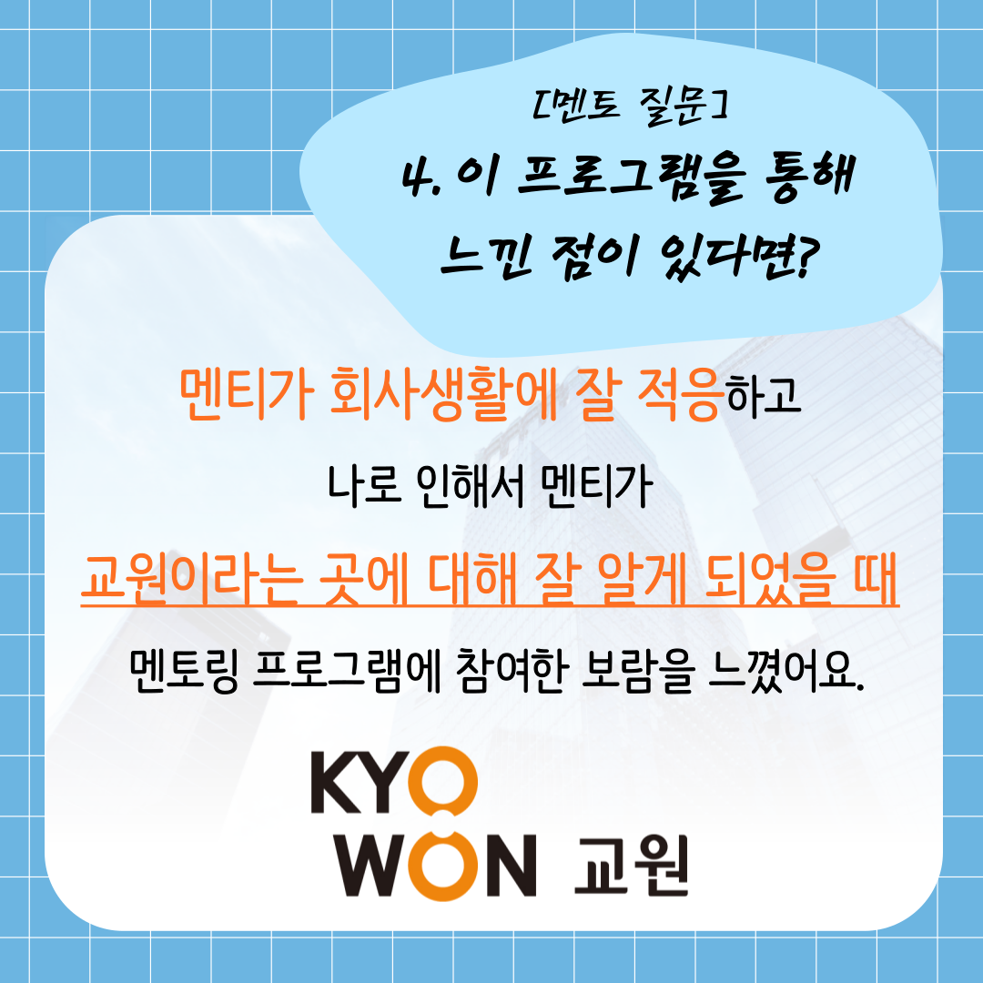 A4. 멘티가 빠르게 교원문화와 회사생활에 적응하는 것이 멘토링 프로그램의 취지라고 생각해요.