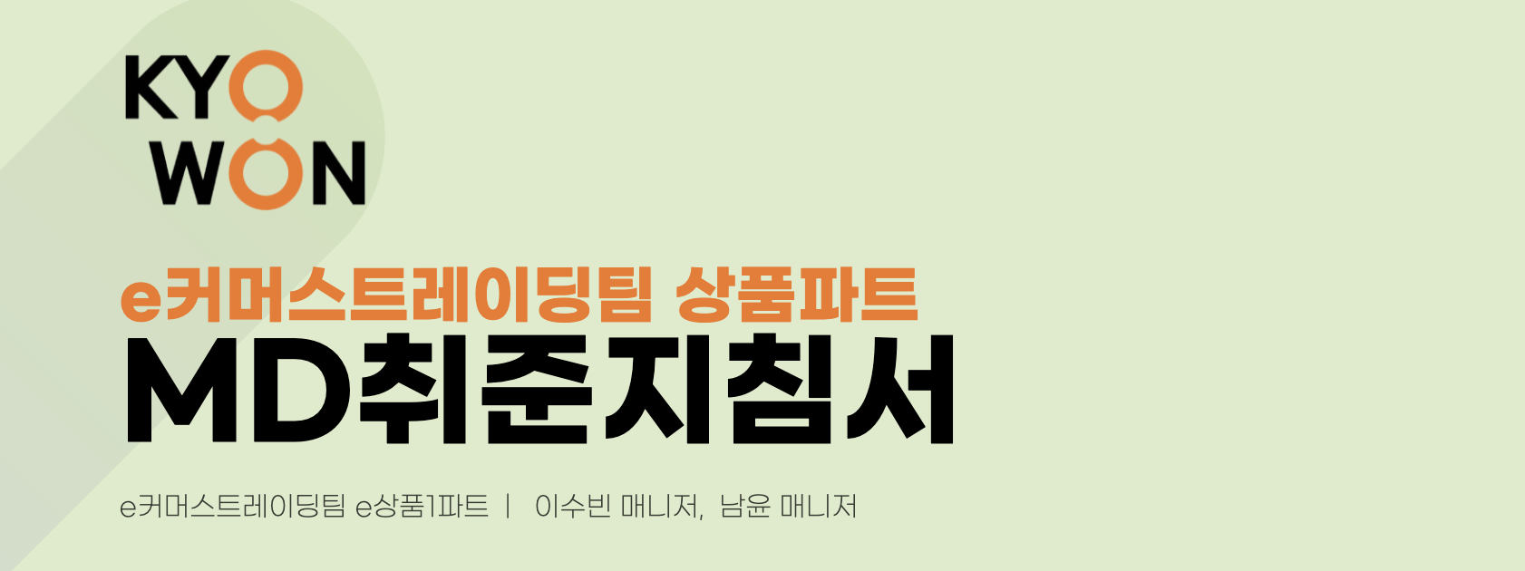 남윤M MD가 상품과 관련된 a부터 z까지의 업무를 수행한다는 것은 다른 커머스 MD와 교원 MD 모두 다 비슷합니다. 한 편, 교원 e커머스는 신생 플랫폼들을 운영하고 있다 보니 (K멤버스 운영기간: 약 2년, 마켓85 운영기간: 1년 이상) 상당히 많은 도전과 함께 다양한 것들을 시도해볼 수 있습니다.