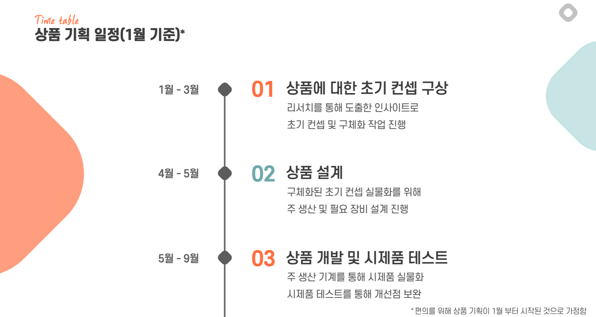 초반에는 상품에 대한 초기 컨셉을 구상하고 관련 자료와 인사이트를 도출하며 사양을 구체화시킵니다(약 3~4달). 이후 상품에 대한 특징이 정해지면 상품을 설계하기 시작합니다(약 1~2달). 그 뒤 개발기간(약 3~4달), 시제품 테스트(약 1달)를 통해 상품을 고도화시킵니다.