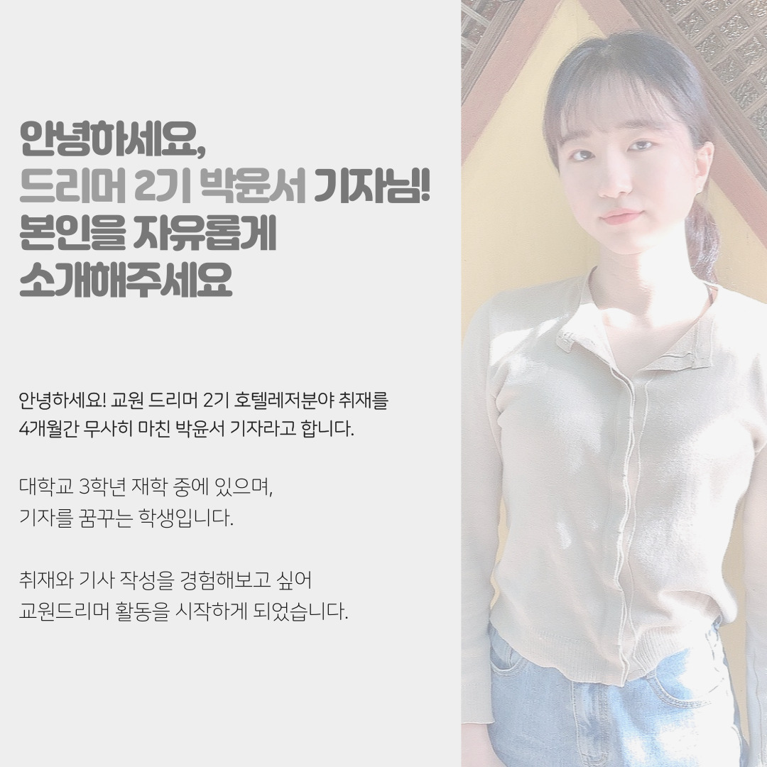 A. 안녕하세요. 교원드리머 2기 호텔레저사업분야 취재를 담당한 박윤서 기자입니다.