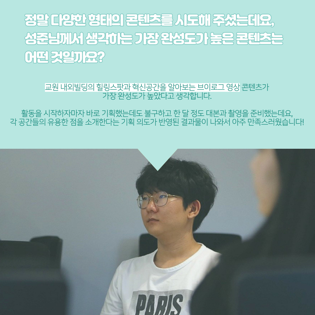 또한 콘텐츠 기획과 촬영에 대한 자신감도 더 생긴 것 같습니다. 평소 제작하고 싶었던 분야에 도전하다보니 더 아이디어도 잘 나오고, 구성원들과 케미스트리도 좋았던 것 같습니다.