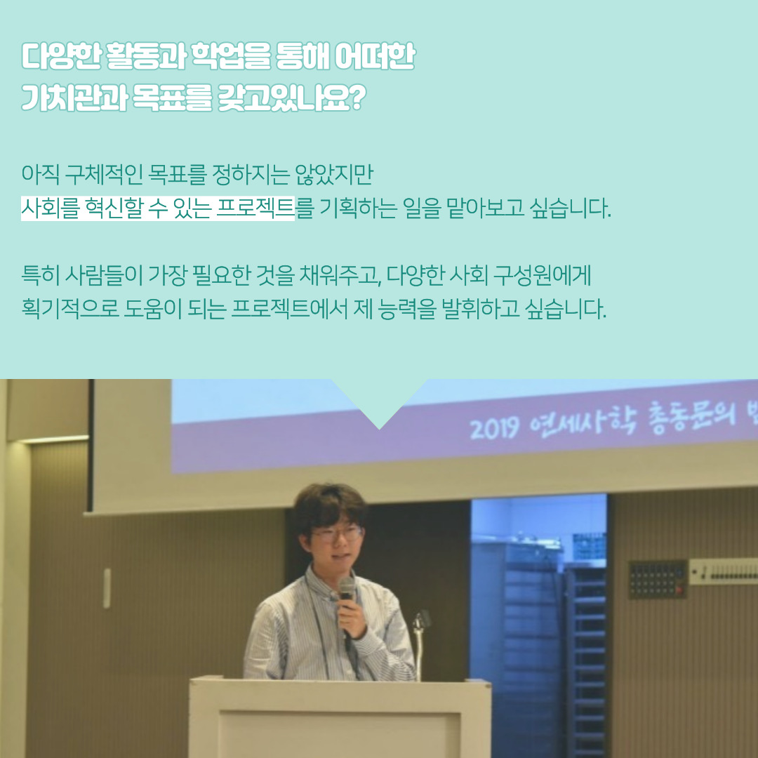 아직 구체적인 목표를 정하지는 않았지만 사회를 혁신할 수 있는 프로젝트를 기획하는 일을 맡아보고 싶습니다.