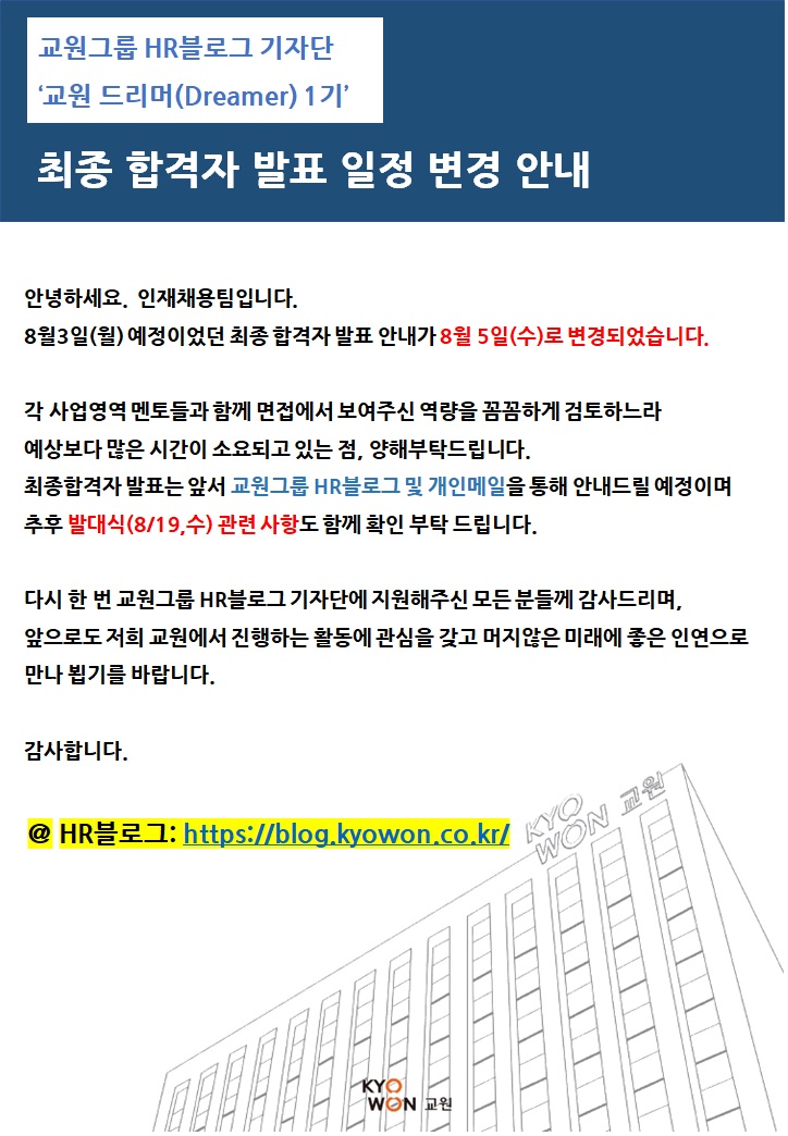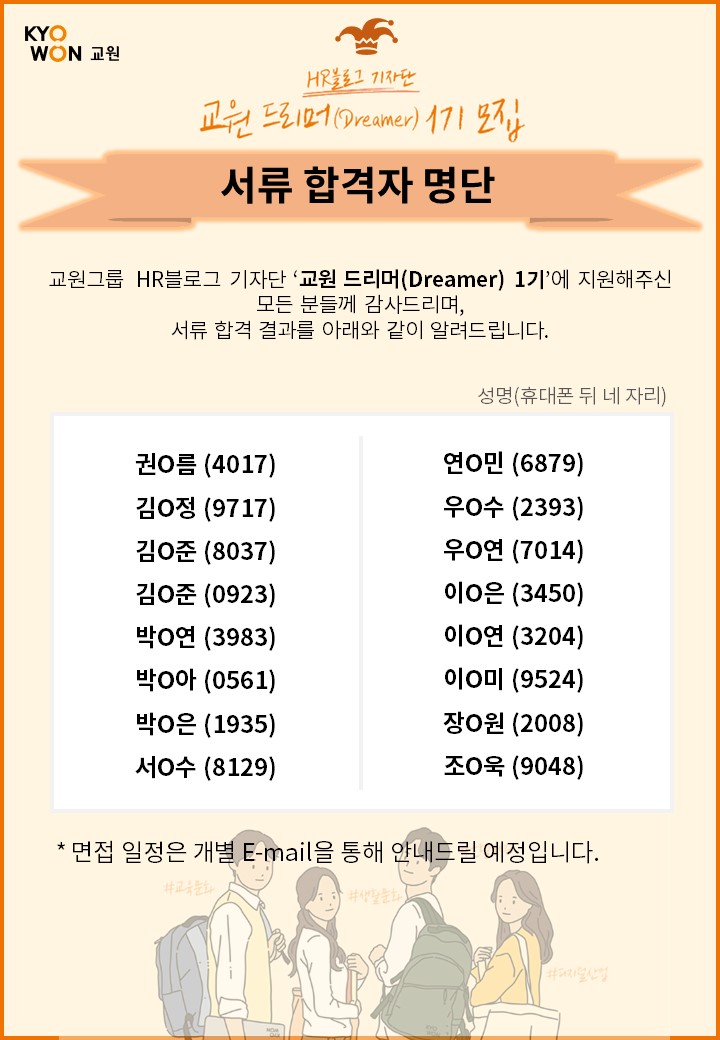 안녕하세요, 즐거운 소식을 안고 돌아온 인재채용팀입니다. 바로 많은 분들께서 기다리시던 교원 드리머 (Dreamer) 기자단 2기 합격자 발표입니다! 우선 교원과 함께 하시게 될 합격자 기자단 여러분들을 진심으로 환영합니다! 드리머 기자단 2기 활동을 통해 교원과 소중한 인연을 만들고 다양한 역량을 자유롭게 발휘하길 바라며 다시 얼굴 보는 그날까지 즐거운 마음으로 기다리고 있겠습니다 :) 또한 이번 기회를 통해 교원과 함께 하지 못하시는 분들께도 귀한 시간 내주셔서 감사하다는 말씀을 전하고 싶습니다. 뛰어난 역량에도 불구하고 교원 드리머와 함께 못하시는 점 아쉽게 생각하며 추후 다른 기회를 통해 교원과 소중한 인연을 맺기를 바랍니다. 추후 일정에 대해서는 합격자 분들께 이메일을 개별적으로 보내드릴 예정이..