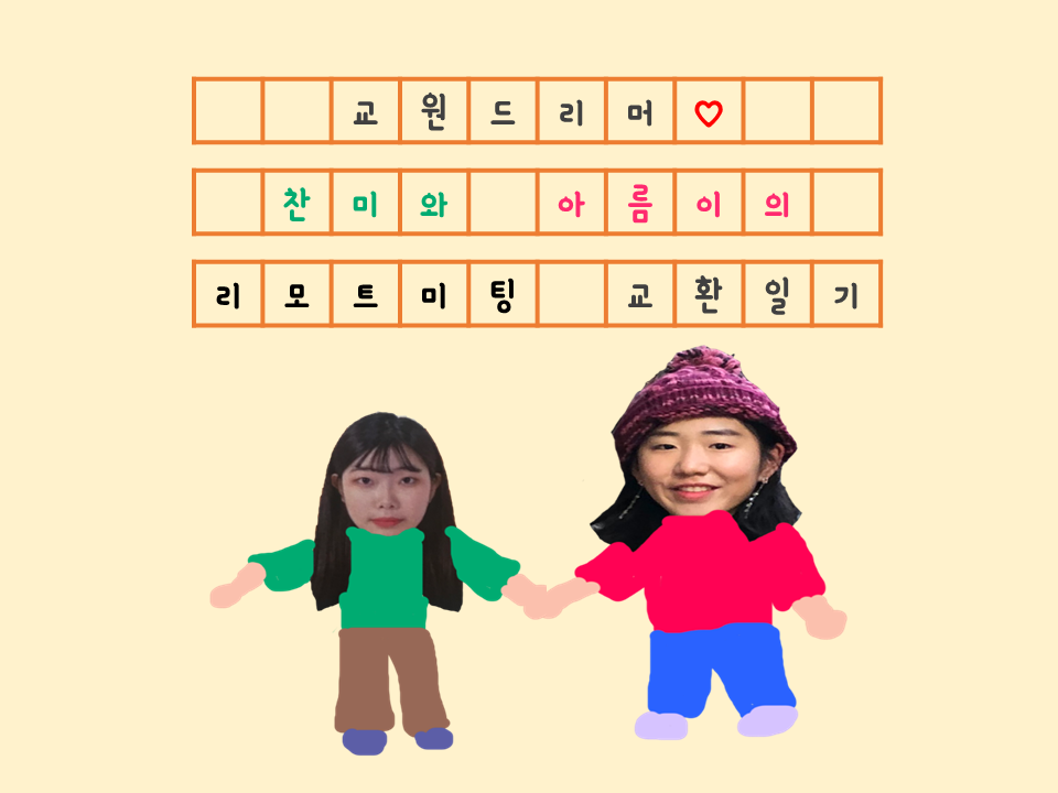 교원 드리머(Kyowon Dreamer) 1기 리모트 미팅 후기 안녕하세요! 교육문화사업부문 소식을 전하게 된 교원 드리머(Kyowon Dreamer) 1기 권아름, 이찬미입니다. 9월부터 12월까지 좋은 콘텐츠 작성하도록 노력하겠습니다:) 이번주 목요일인 9월 10일에 교원 드리머 1기 사전 미팅이 진행되었는데요~ 워밍업으로 이번 '리모트 미팅 후기'를 주제로 콘텐츠를 작성하게 되었습니다. 같은 교육문화사업부문에 속한 드리머끼리 9월 10일 리모트 미팅을 주제로 교!환!일!기!를 해봤어요 > Kyowon Dreamer/드리머 1기 2020.09.13